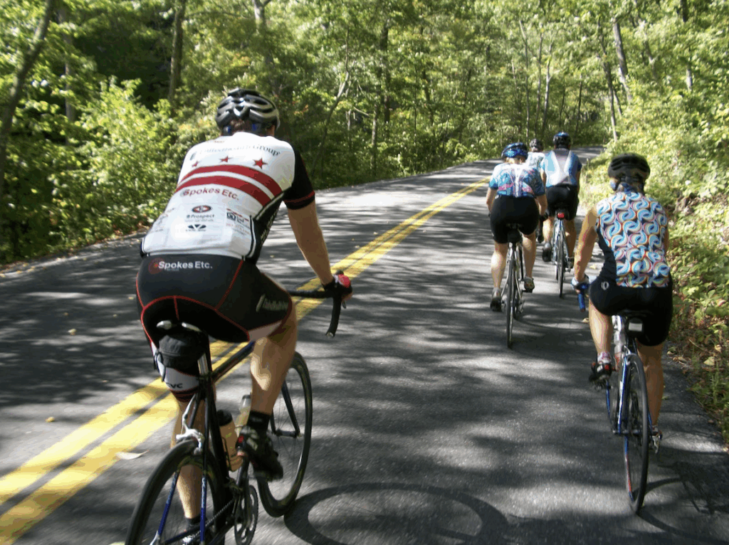 Around Mile 10, we hit our first real hill, and four of the six fell off the pace. That would be my pace. I had been soft-pedaling before, but this time I was passed by a rider in a “Spokes” jersey, so I sat on his wheel. I never saw the other four riders the rest of the day.