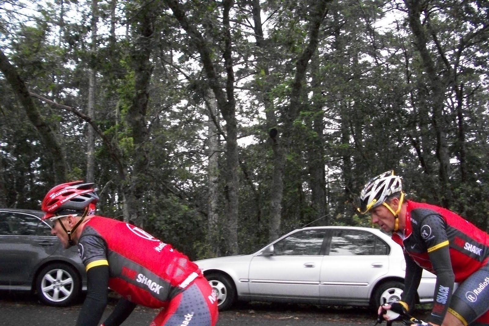 Two leaders were in a breakaway but after they passed us 30 seconds behind came the train of Team Radio Shack. There were five guys in the front with Levi on third wheel and Lance on fourth. And they were marked by Garmin-Transitions.