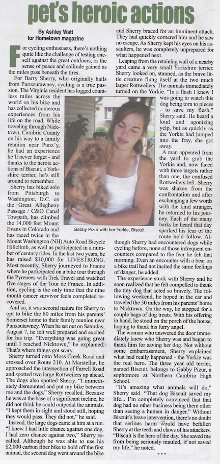 On Friday, August 27, 2010, I did a phone interview with Ashley Watt, a newspaper reporter for the local newspaper in Ebensburg or Northern Cambria. I thought the focus was on Biscuit, the Yorkie, who saved my butt/life. I don’t know when or where it was published, but a magazine called Punxsutawney Hometown picked up the story for their October issue.