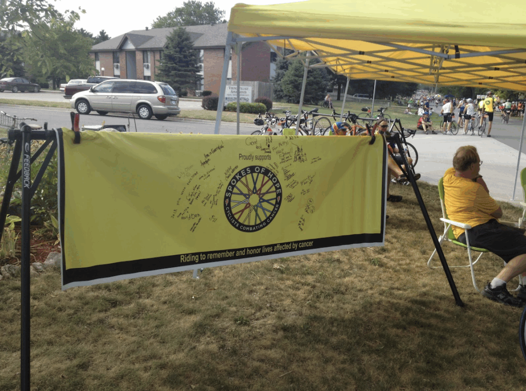 I didn’t wear any cancer apparel, which would have come in handy today. Riding solo, I came to Story City and saw the Spokes of Hope banner on the left. I hit the brakes, then went over and introduced myself.