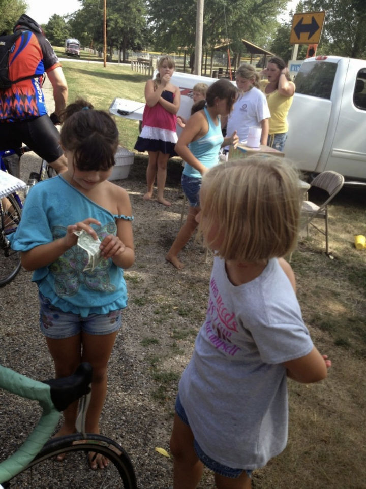 Many groups or people sold water. Some gave away free ice water. The Air Force Reserve had tanker trucks on the route at one location per day for free water. Residents had sprinklers next to the road, and some had garden hoses and were more than willing to hose down riders who wanted to be drenched.