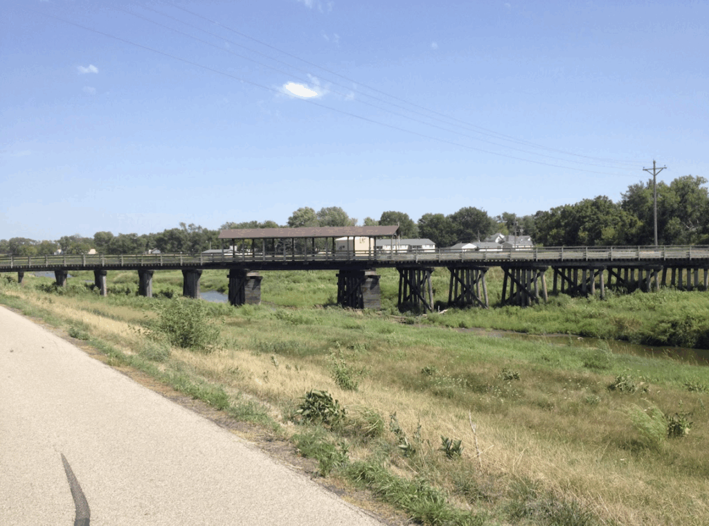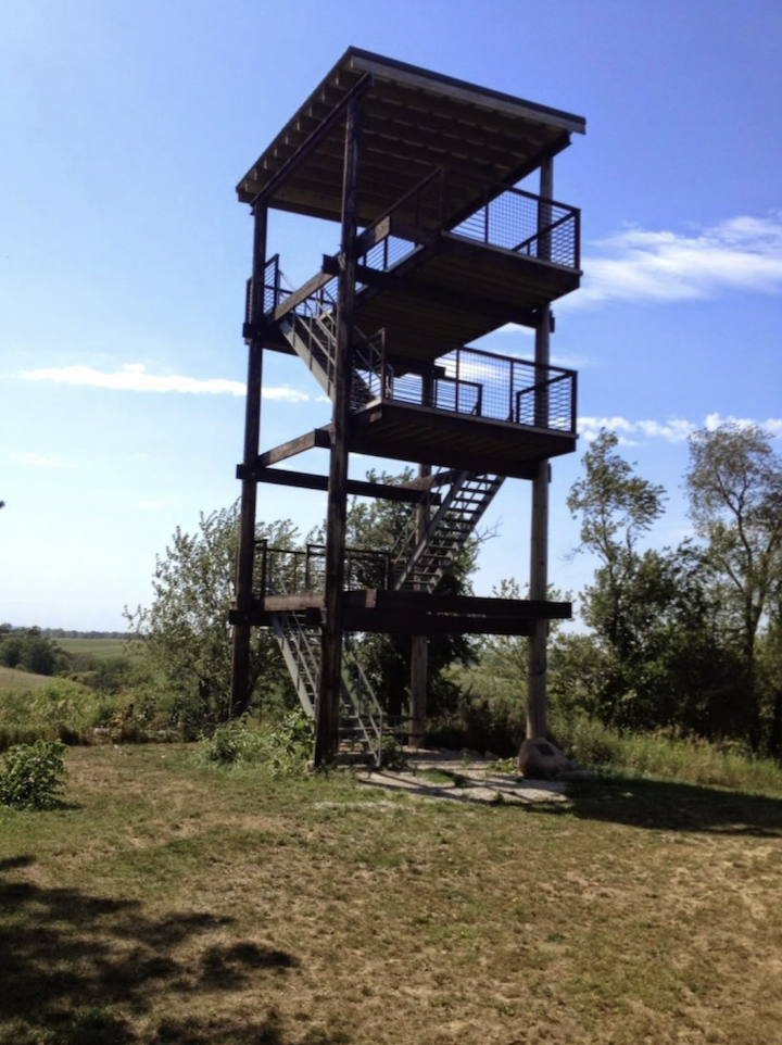 Arriving Marshalltown, I stopped at a convenience store and talked to the manager. I asked him where the locals ride, and he told me of a river path on the levee that goes 10 miles out of town. Once set up my tent, I went for a quiet 10-mile ride and found a delightful nature center at Grimes Farm. I even climbed a steep hill, on a grass path, to an observation tower.