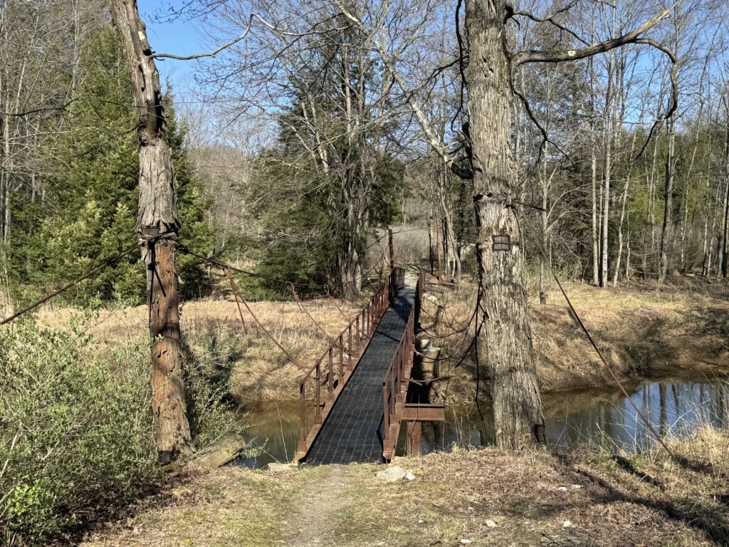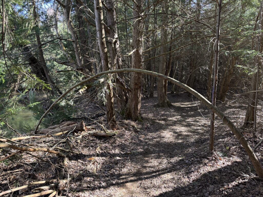The limestone gave way to some gravel. And then single track. There was a tree down blocking access, and I simply went over it (carry, not jump). There was a very narrow bridge, and the trail declared itself best for a mountain bike. I had the next best thing, I guess – I was on a gravel bike. I decided not to return this way.