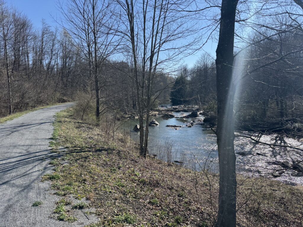 I came without a plan, and that was what I got. In 2002, Andrew and I rode the full length of the Ghost Town Trail from Dillton to Nanty Glo and back. And in 2014, I met my fourth cousin, Nicole Sokira, in Ebensburg, and we rode the GTT to Dilltown. But that was my extent of riding this trail.