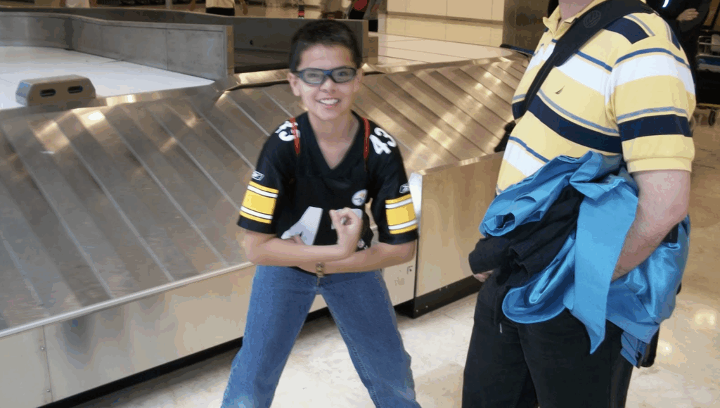 At baggage claim, I saw a young boy wearing a Pittsburgh Steelers #43 (Troy Polomalu) jersey. I assumed he was from Pittsburgh. He wasn’t. He and his dad are Spaniards. But he likes the way Troy looks. And he posed for me. Steelers Nation is global.