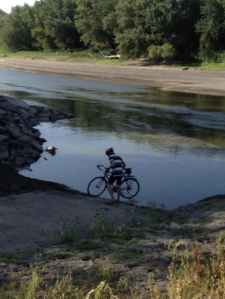 I found Oak Hill State Park, which led to the Big Sioux River, the border between South Dakota and Iowa. There were only a few riders here, and each dipped their rear wheel in the river. I didn’t.