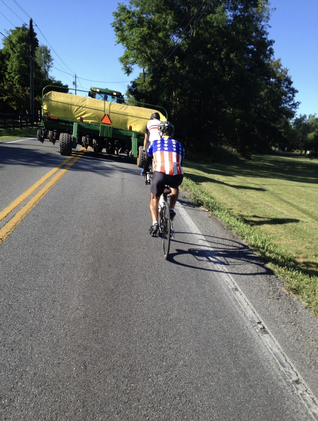 We caught a tractor pulling some machinery at 20-22 mph. Perfect. We pulled in behind him, and he created the perfect wind block. We rode in his draft for about two miles before he turned off. Rest Stop #1 was at the Summit Point Raceway. It was pretty cool. Some riders took to the race track for extra miles.
